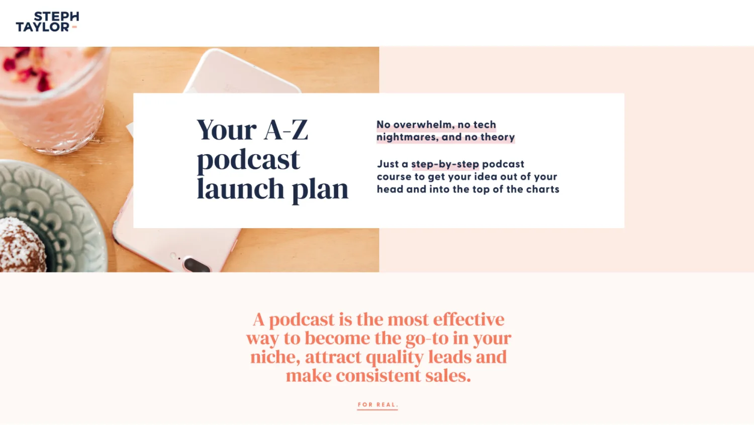 - Help your reader self-qualify; for example, Steph Taylor’s page emphasizes this course is for podcast newbies and not someone who already knows their way around podcasting tech and processes