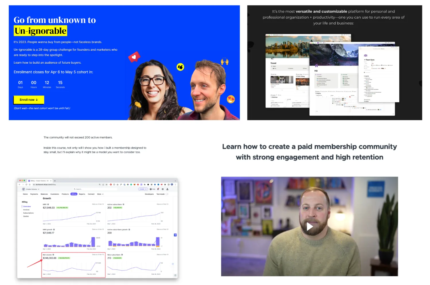 Header image on Katelyn Bourgoin and Demand Curve’s Un-ignorable course page (top left), mockup on Marie Poulin’s Notion Mastery page (top right), and charts and video on Jay Clouse’s course page for Build a Beloved Membership (bottom).