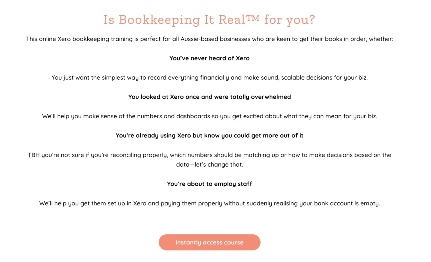 One of the sections with an enticing CTA on the course page for Bookkeeping It Real online course. Image via Straight Up Bookkeeping.