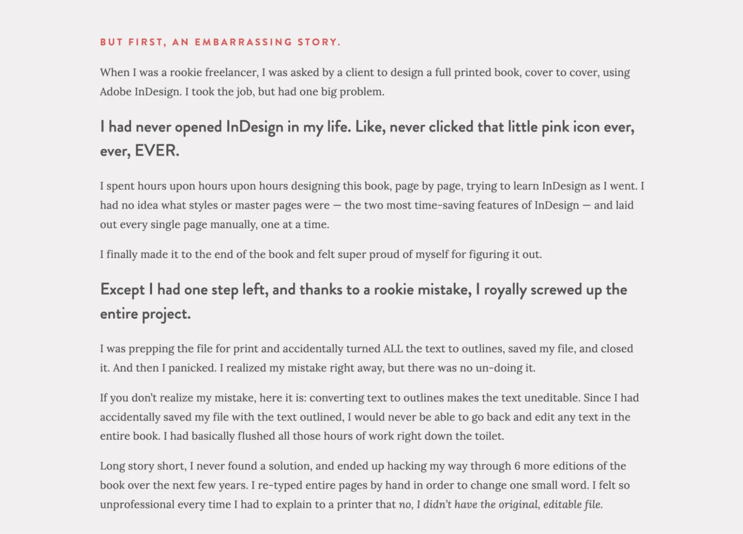 Kelsey Baldwin, the creator and designer behind Paper & Oats, tells a powerful story on her online course sales page focused on In Design. Image via The InDesign Field Guide.