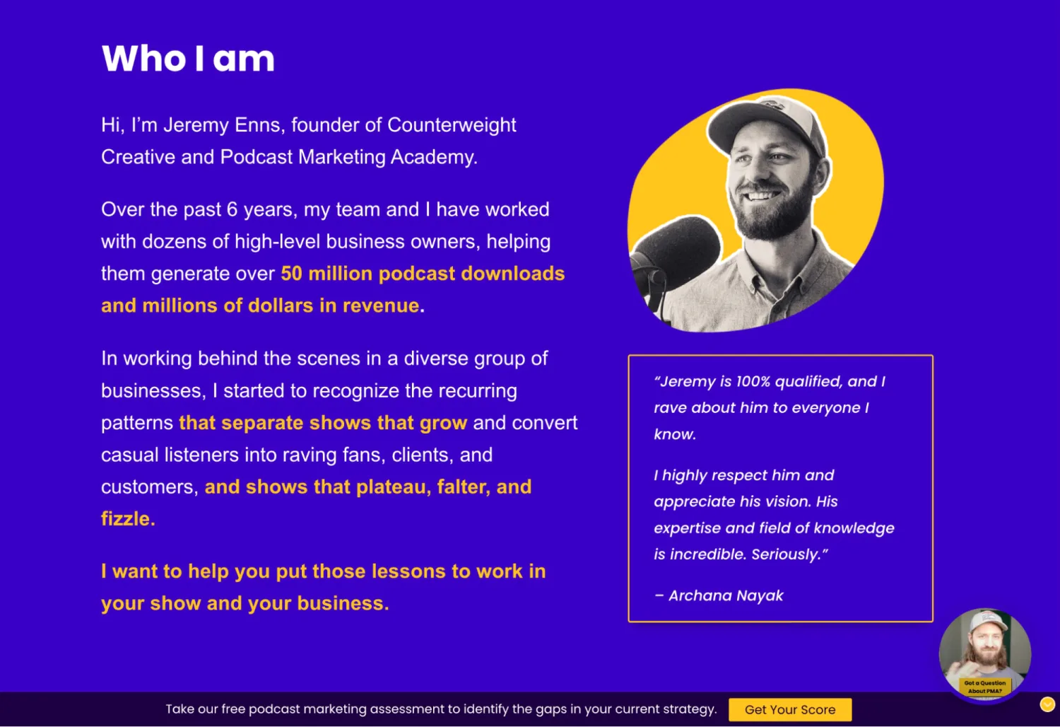 Jeremy Enns’ bio on his Podcast Marketing Academy course page, cleverly paired up with a testimonial about his expertise and field of knowledge. Image via Podcast Marketing Academy.