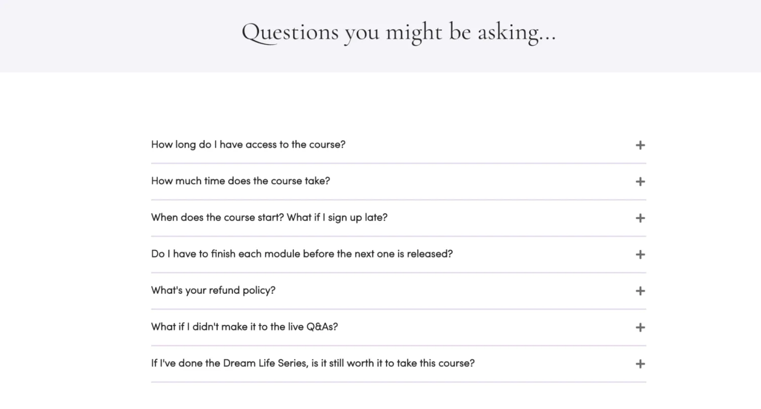 The FAQ section on the Lavendaire’s Create Your Dream Life course page. Image via Lavendaire.