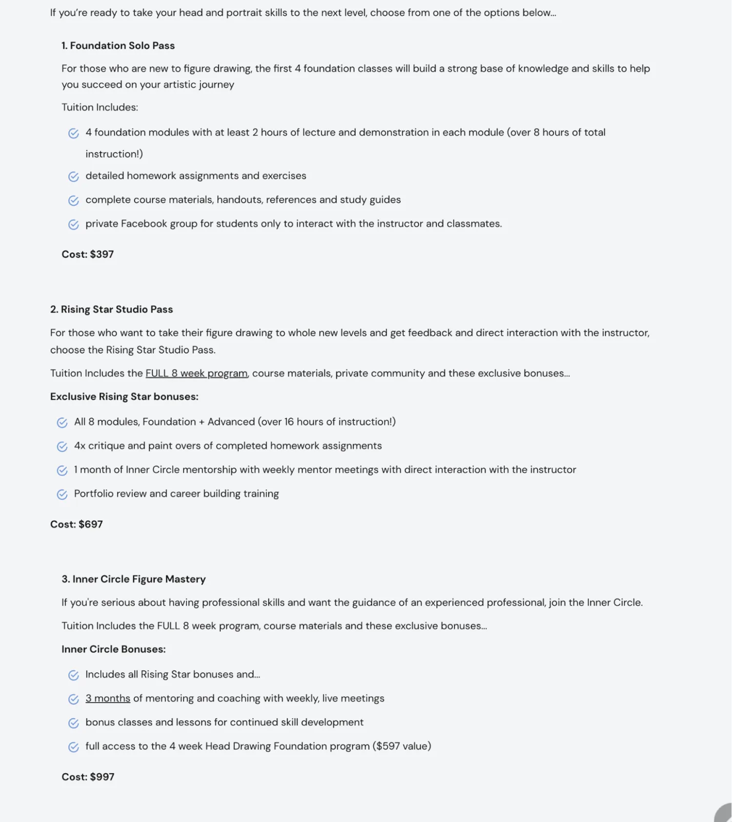 The pricing details for the figure drawing masterclass by Chris Legaspi. Image via Draw With Chris.