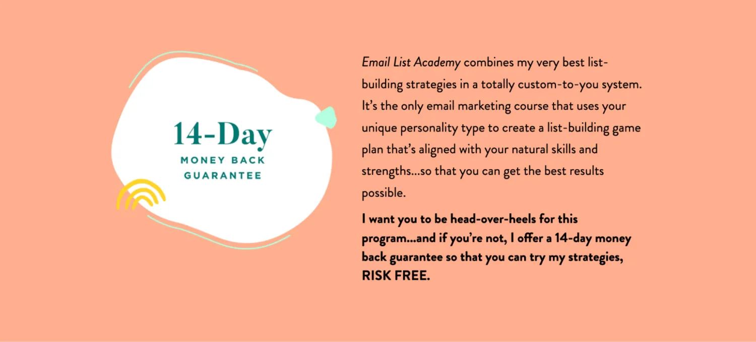 The money back guarantee on the course sales page for Melyssa Griffin’s Email List Academy course. Image via Email List Academy.