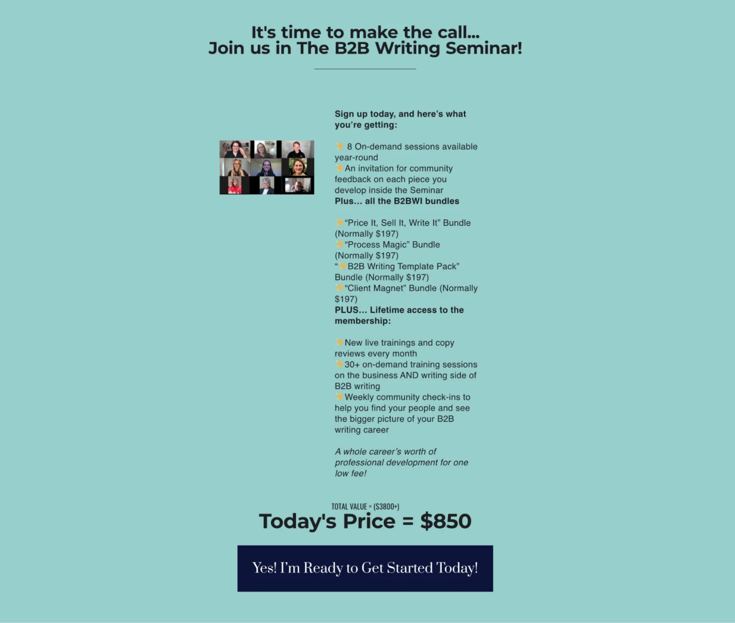Instead of including one final, lone “Buy now” button at the bottom of your page, use this space to reiterate and summarize the main message and the value of your course.