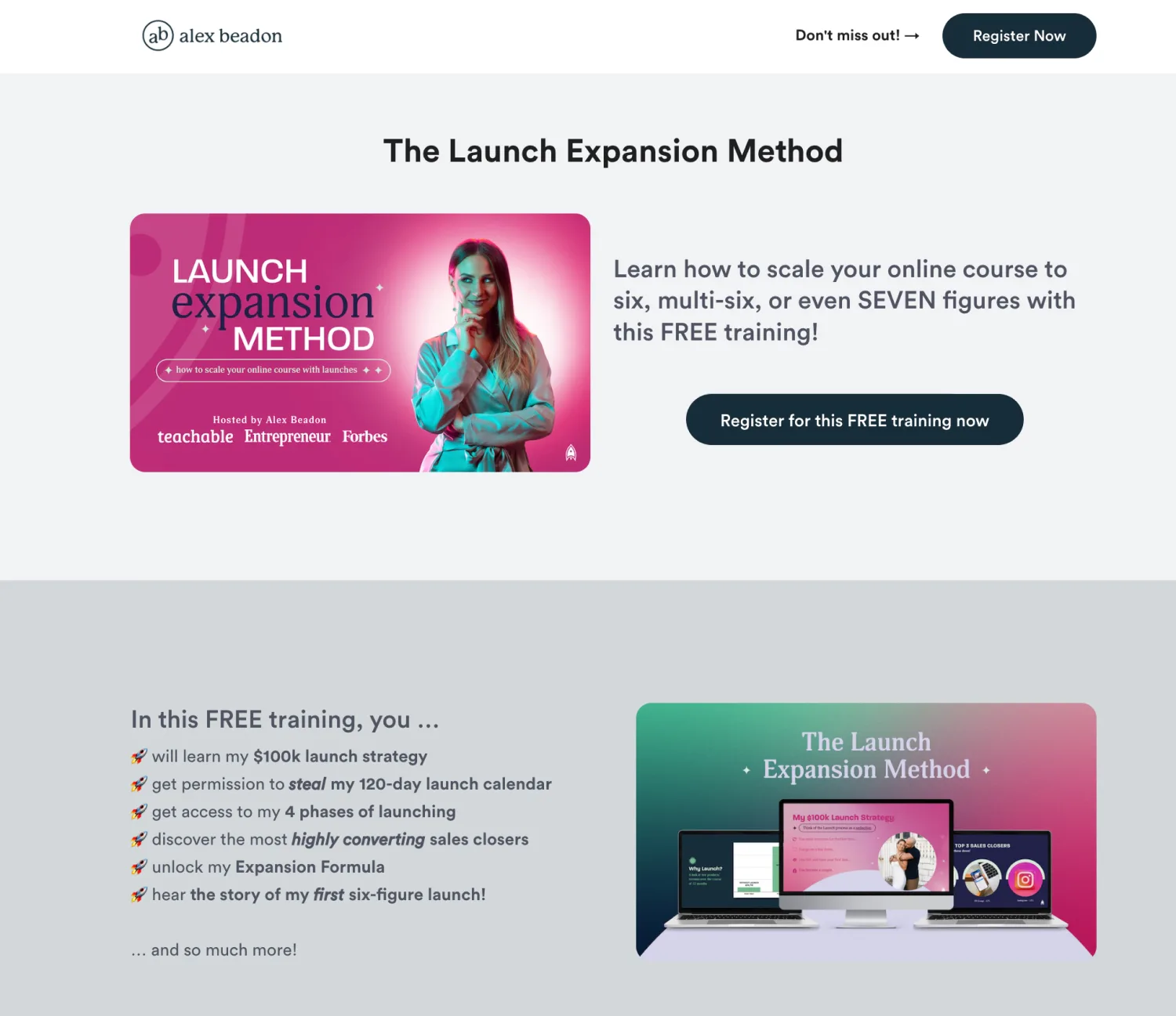Alex Beadon, a launch strategist, offers her Launch Expansion Method webinar as a promotion for and an introduction to her signature program, Together We Launch. Image via Alex Beadon.