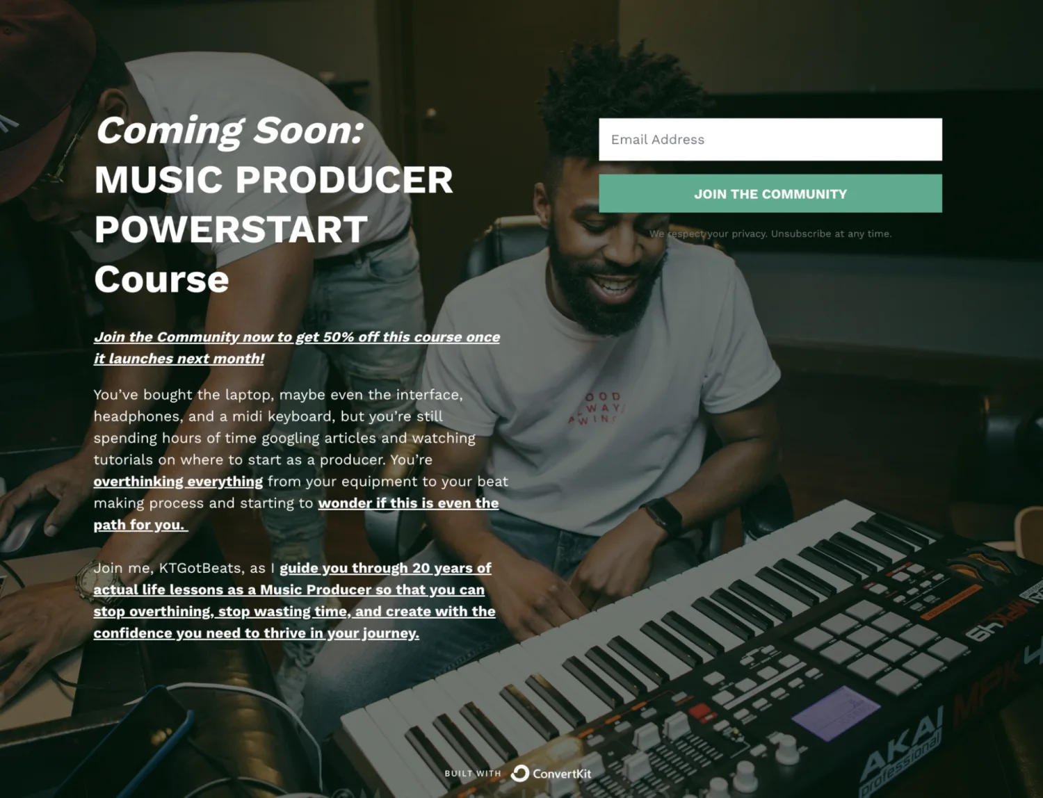 A coming soon landing page example for a music production course, along with a discount once the launch is live. Image via KTGotBeats.