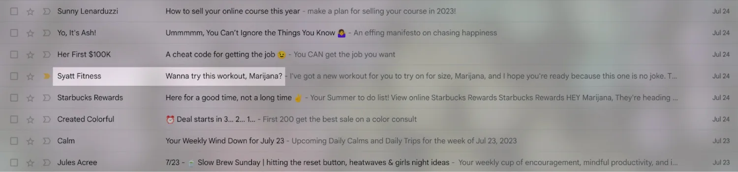 Jordan Syatt, also known as Syatt Fitness, is a strength and nutrition coach who runs a YouTube channel and a paid community. He achieved that stand-out effect by asking a question in an email subject line and addressing it directly to the recipient.