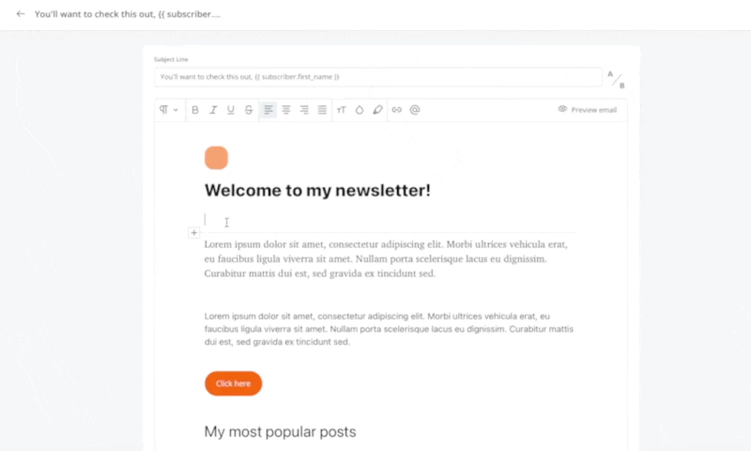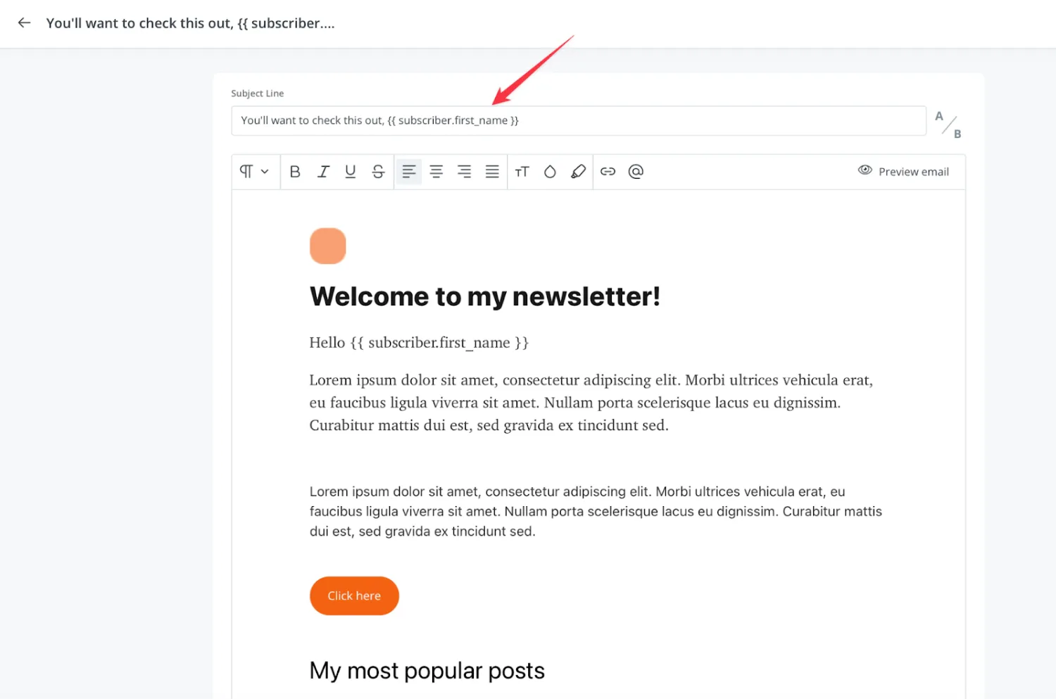 Kit makes it easy to address your subscribers by their names throughout your email, again with the shortcode {{ subscriber.first_name }}.