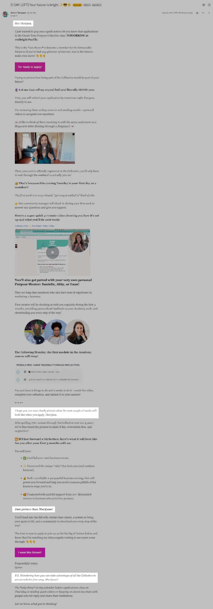 Quinn addresses her subscribers by their name several times in an email that promotes applications for Quinn’s community