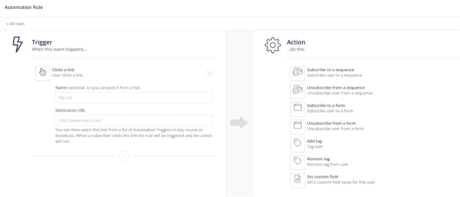 Link triggers are links set up to automatically activate another action once a subscriber clicks on them. Think of them as a simple “if this, then that” formula that lets you specify what happens with your subscriber once they click on a specific link.