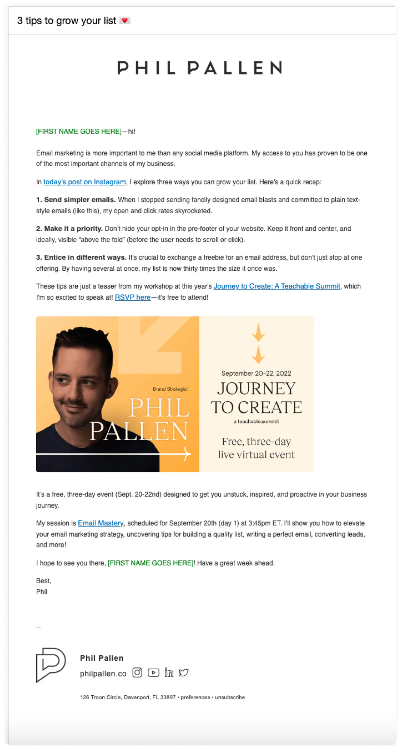 The best advice to grow your email list? “Communicate consistently and communicate in a way that’s true to how you communicate day to day,” says Phil. “If I meet you in real life, it should be the same, even with digital scale. That’s a beautiful thing.”