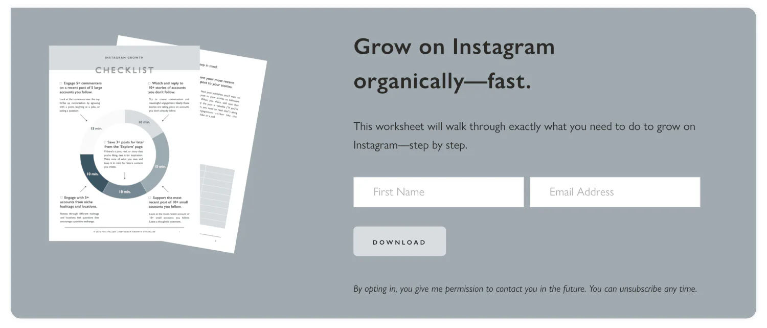 Start by thinking about the information your audience needs and try a few different formats to give them that information. That might look like single-page PDFs or checklists, worksheets or diagrams, a long-form ebook, or access to a mini-course or pre-recorded webinar. “My best performing freebie is all around evergreen content ideas,” says Phil. “I didn’t even think it would perform that well because it wasn’t my favorite to make. But it’s been downloaded over 22,000 times.”