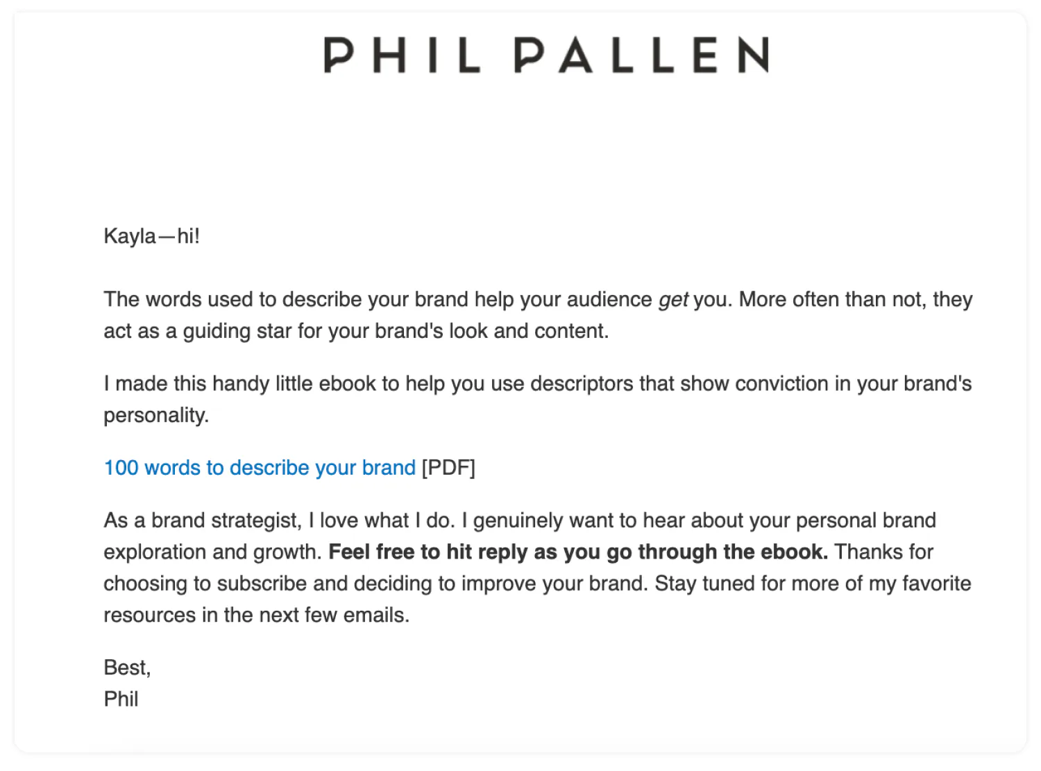 The first email in Phil’s welcome sequence delivers the freebie with personal flair.