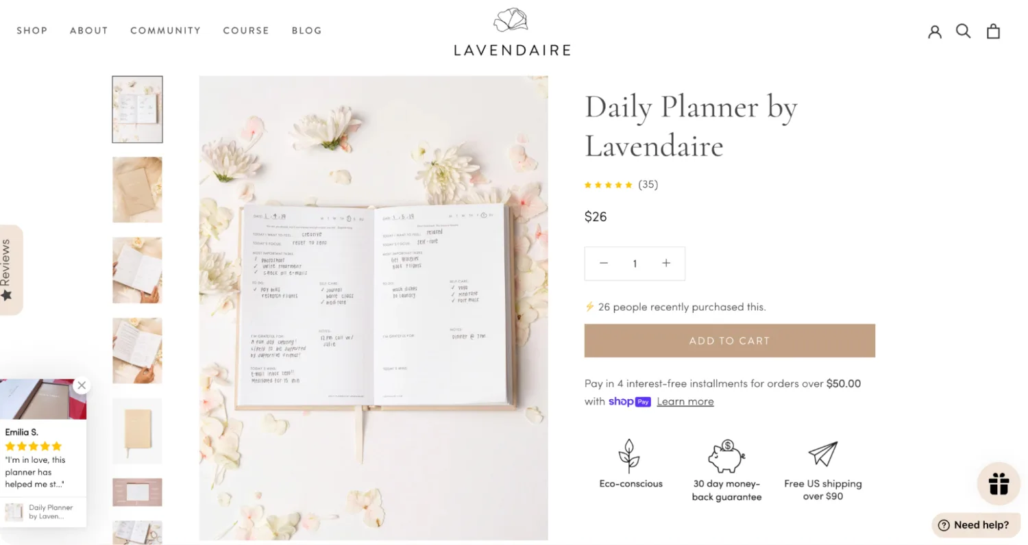 Now, the Lavendaire site has planners, journals, notebooks, stickers, apparel, and more. Physical products comprise 64% of Aileen’s revenue, alongside YouTube ads, brand deals, course sales, and affiliate and podcast income.