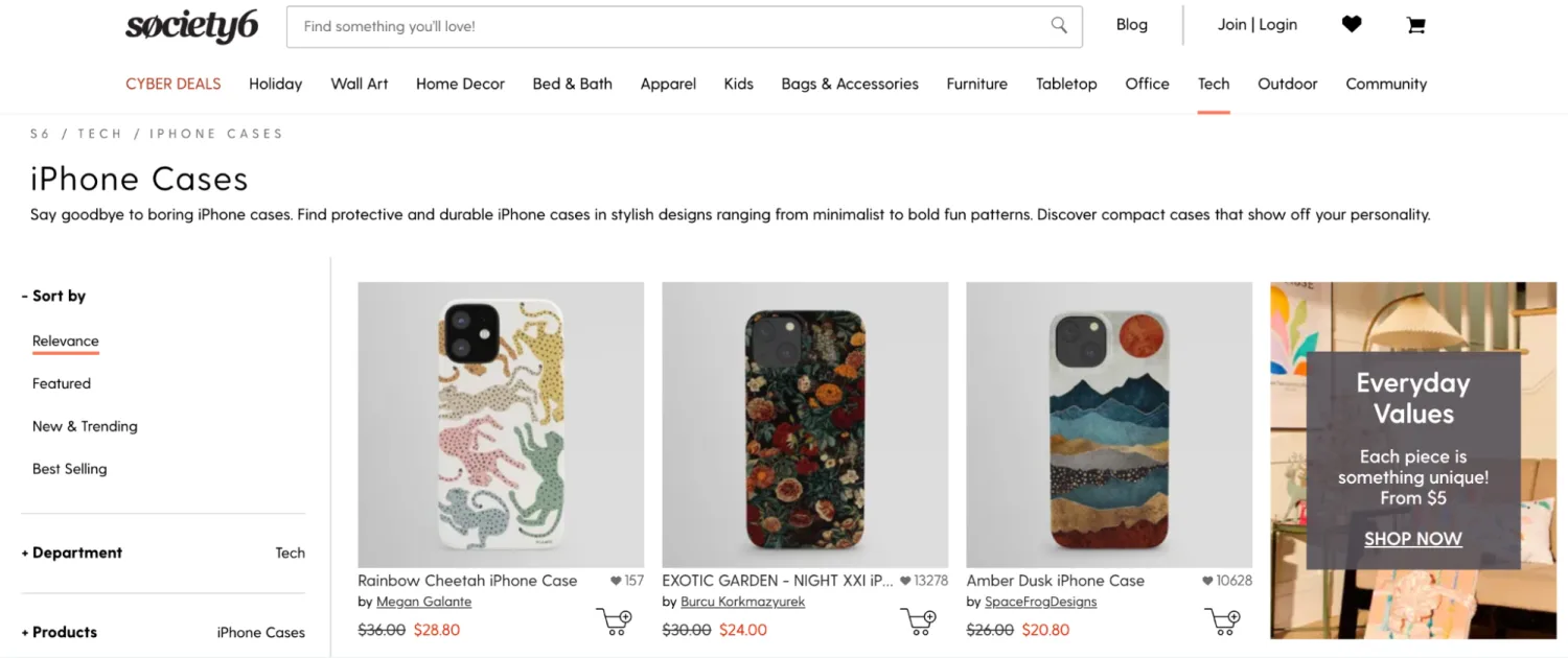 - Society6 for custom-printed phone cases, art prints, bags, and more