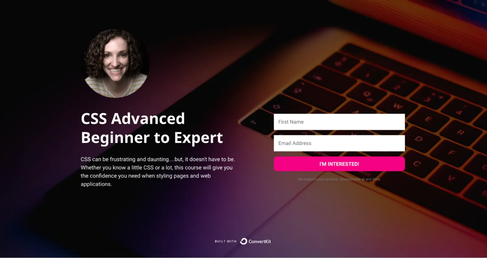 Amy from SelfTeach.me teaches designers how to code and developers how to design. Their landing pages collect interest for courses like CSS Advanced Beginner to Expert and Build an App From Scratch.