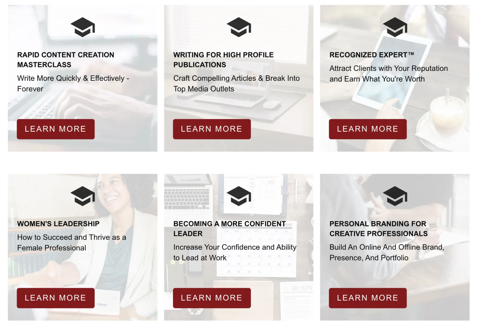 Dorie Clark has a full catalog of professional and personal development courses like Becoming a More Confident Leader and Personal Branding for Women. Dorie used client work and courses to make $100,000 in her first year.