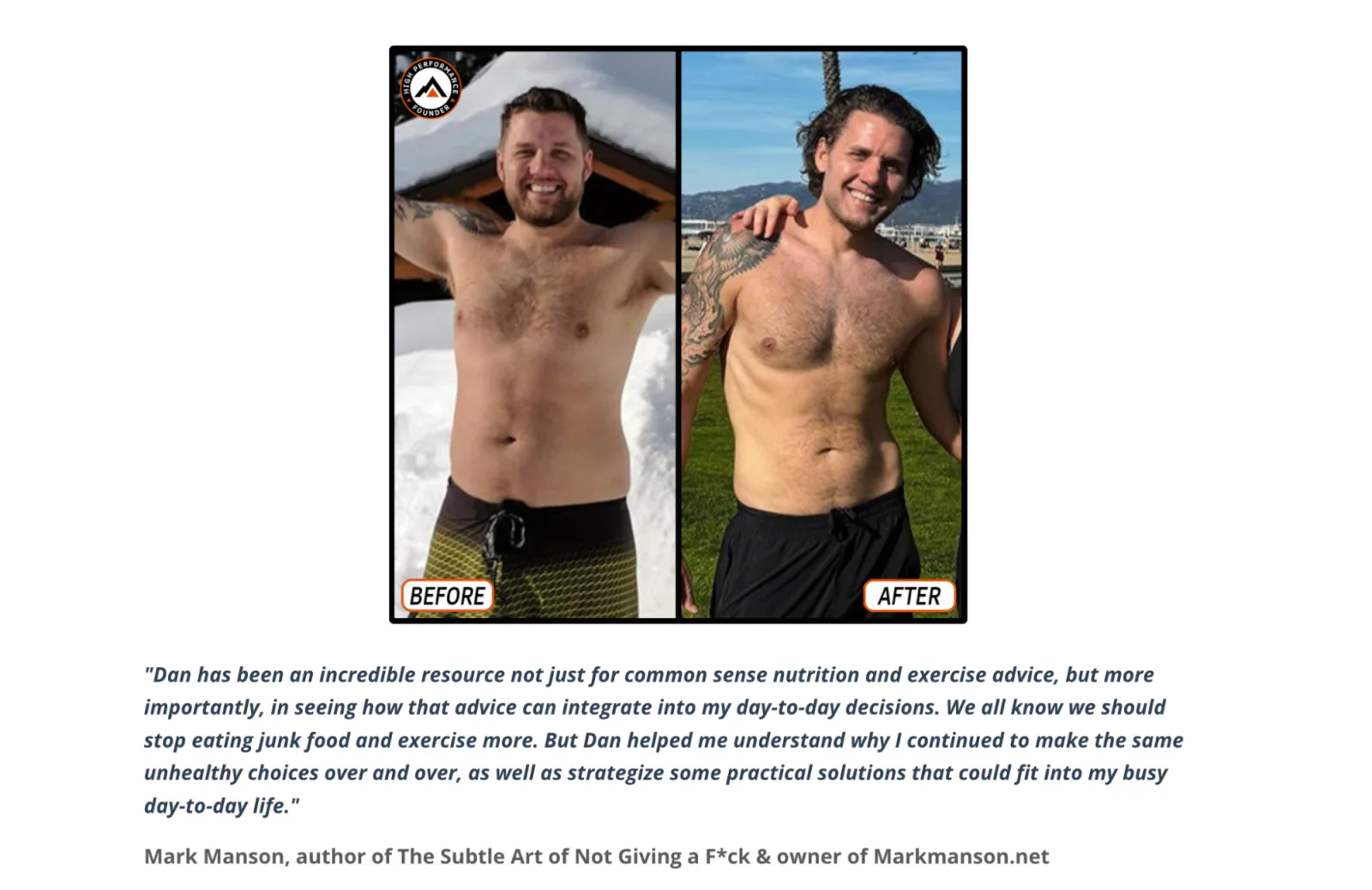 Dan Go is a high-performance coach who helps his clients get in shape and feel their best. On his website, he uses before-and-after images of his clients and a short testimonial to showcase his expertise.