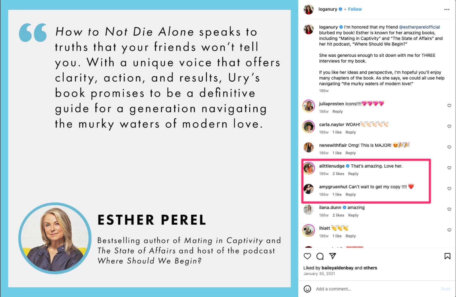 Author and dating coach Logan Ury’s book How to Not Die Alone was blurbed (a short positive review) by the acclaimed relationship therapist and podcaster Esther Perel. Logan shared this blurb to promote her book on Instagram, and the impact was obvious.