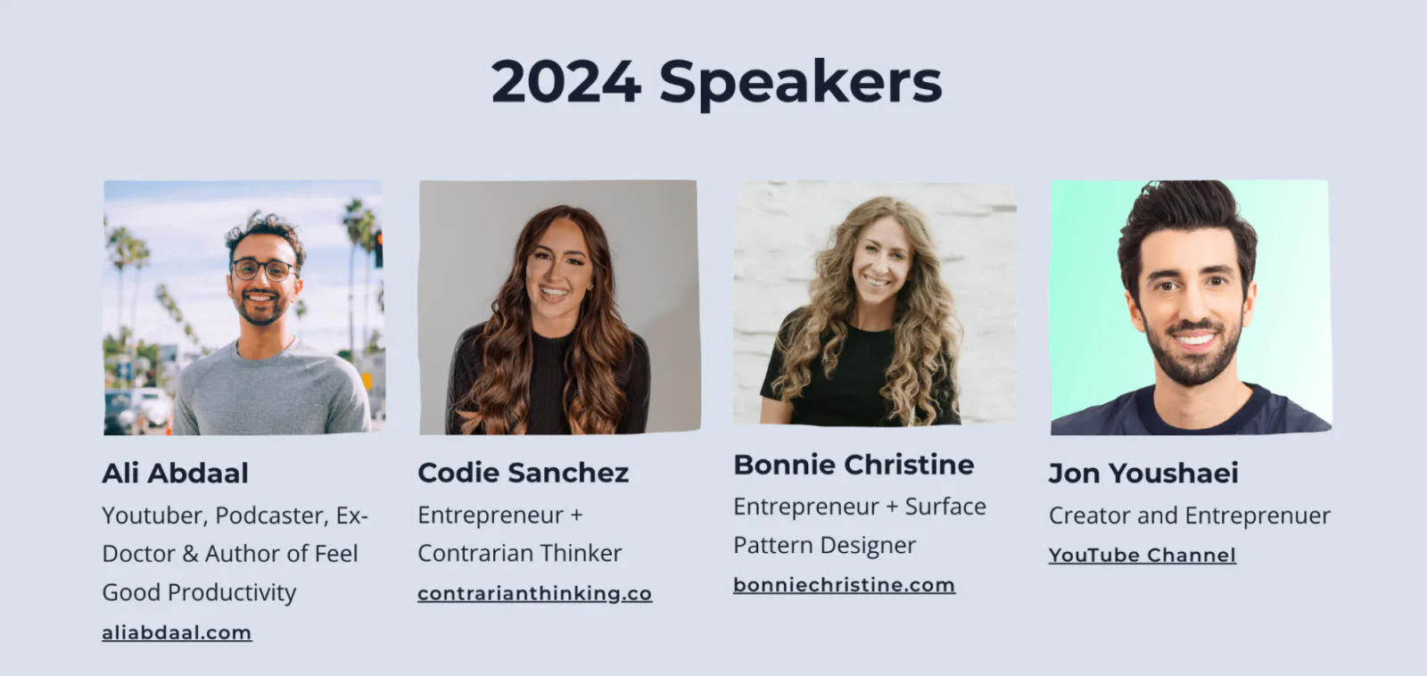 Kit’s Craft + Commerce conference is a practical example of celebrity social proof. In 2024, the speaker line-up was star-studded with popular, successful creators like Ali Abdaal and Bonnie Christine.