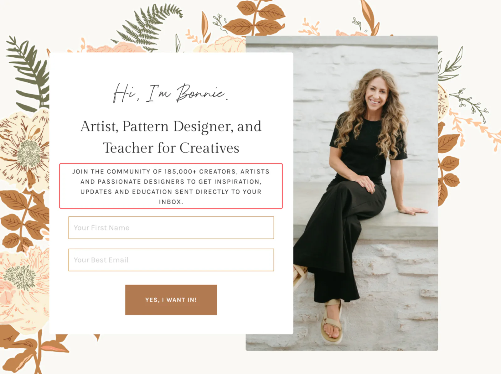 Artist, pattern designer, and teacher Bonnie Christine runs a mega-popular newsletter and isn’t afraid to show it off. In her opt-in form on her site, she tells new subscribers that over 185,000 people have already signed up.