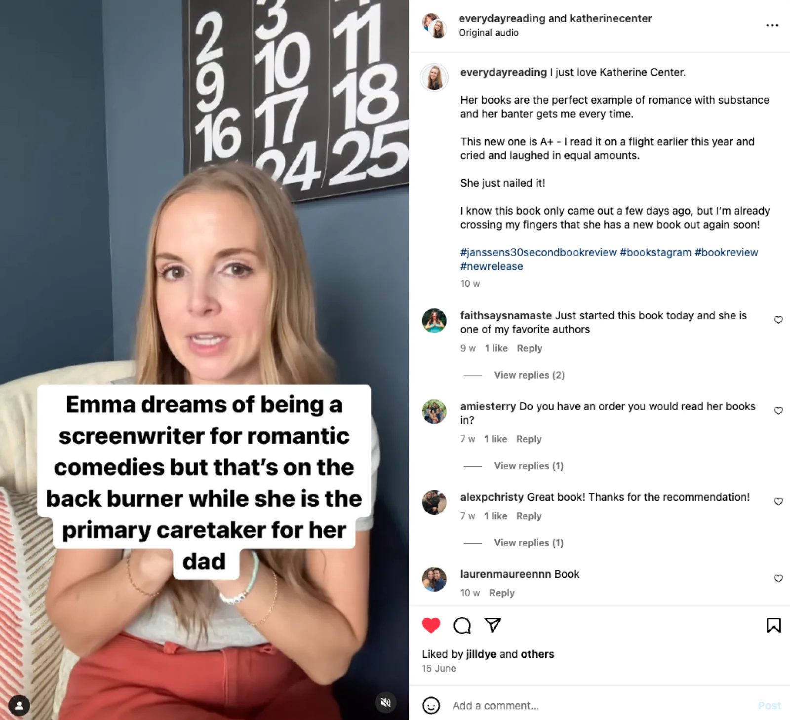 Janssen of Everyday Reading shared a review of the latest Katherine Center book in an Instagram Reel (and Katherine Center collaborated with her on the post, which allows Instagram to show it to her audience, too).