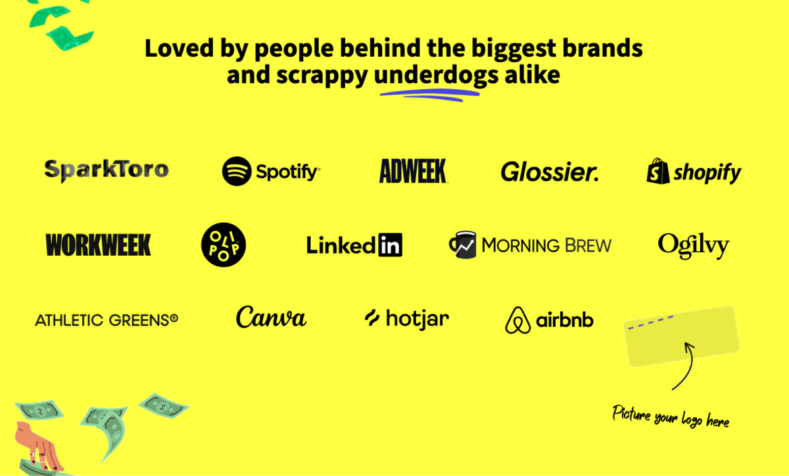 Katelyn Bourgoin, marketer and writer of the Why We Buy newsletter, shows off her client list—a list of companies that love or benefit from her newsletter—on the newsletter sign-up page.