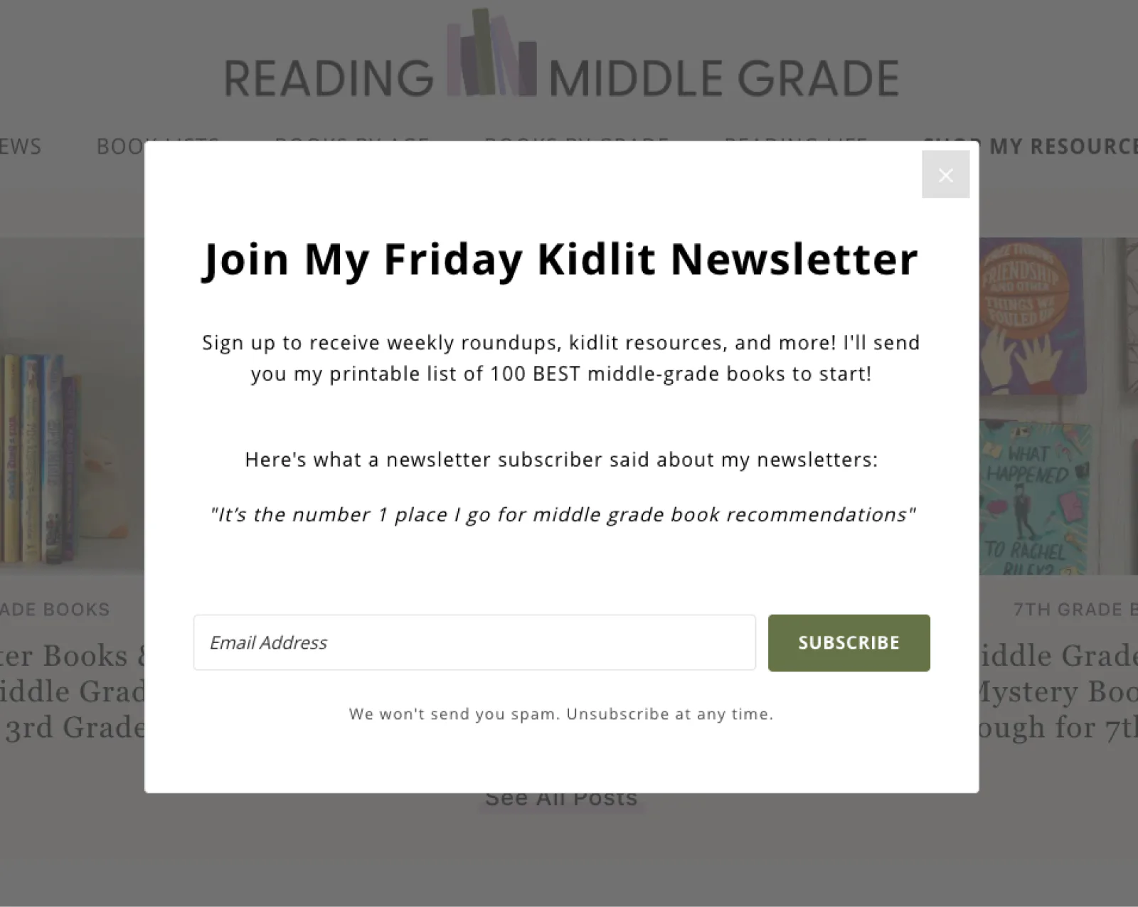 Add short reviews and testimonials to your opt-in forms or pop-ups. On my website, Reading Middle Grade, I share a short testimonial from a newsletter subscriber in the pop-up form.