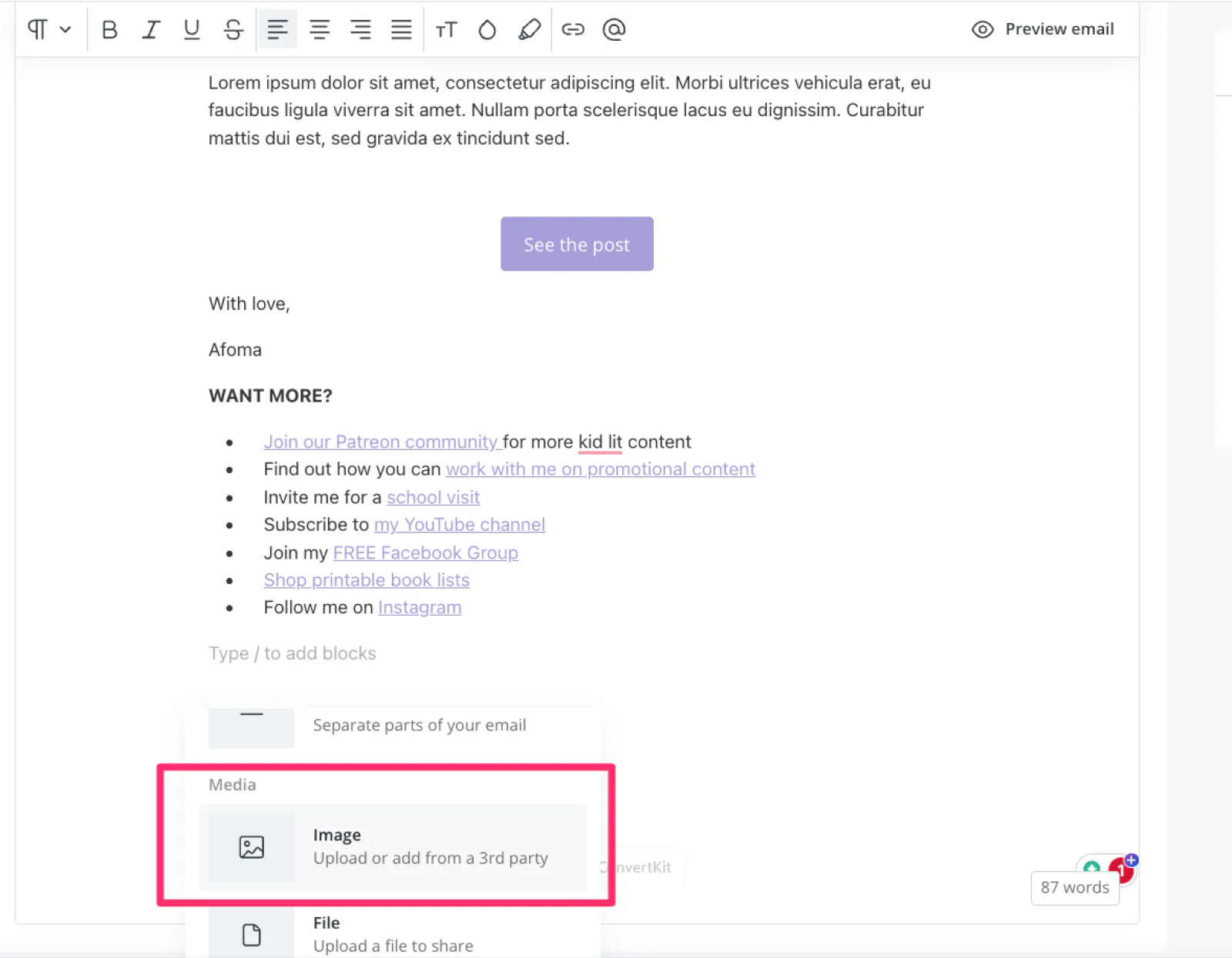 Kit makes it easy to add quotes or images to your email newsletters for effective email marketing.