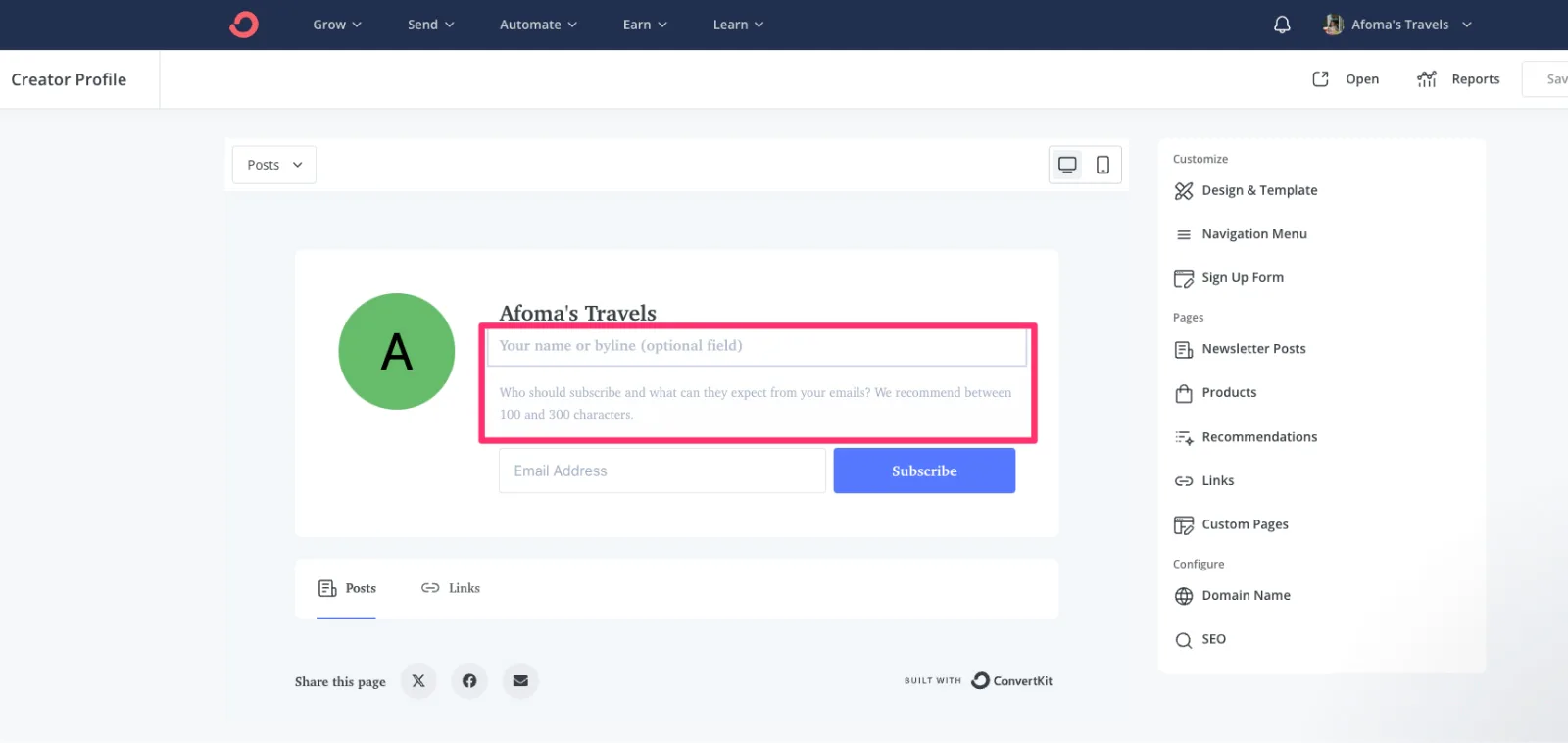 Click on Grow > Creator Profile.