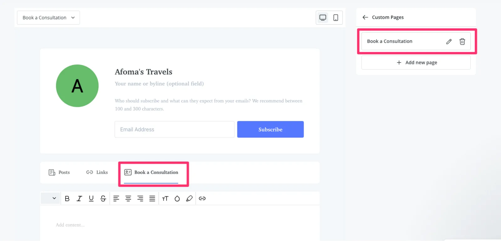 You can also create multiple Custom Pages on your Kit profile. For example, I created a “Book a Consultation” page here. All I’ll need to do is add some copy and a button with a link to book a call with me.