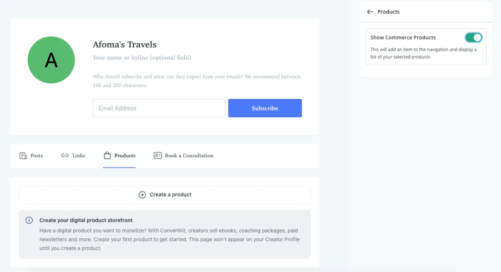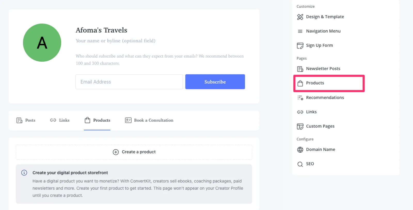 Once your service products are in Kit, you can connect them to your Creator Profile by clicking on Products in the sidebar.