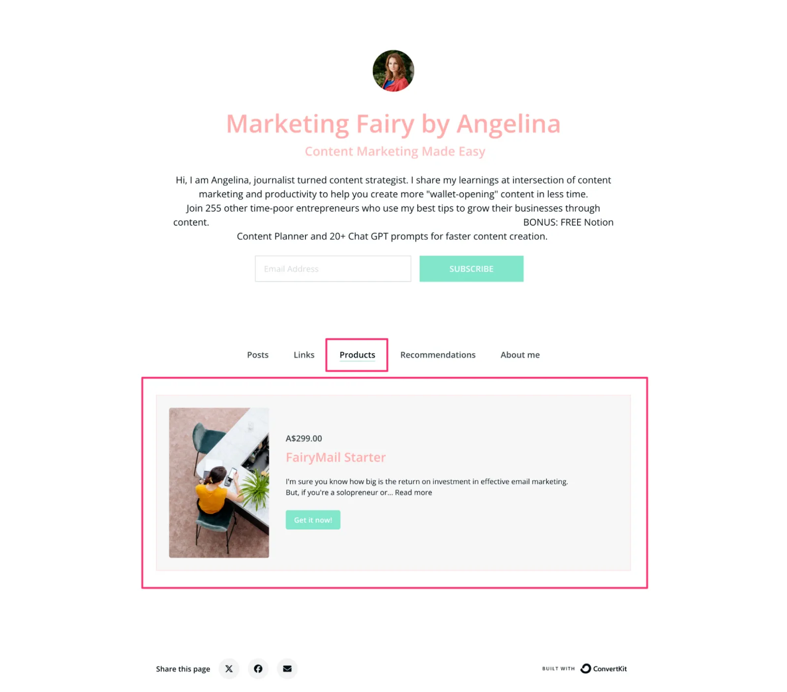 Content Strategist Angelina of Marketing Fairy displays her main service on her Kit Creator page so visitors can learn more about her offerings right away.