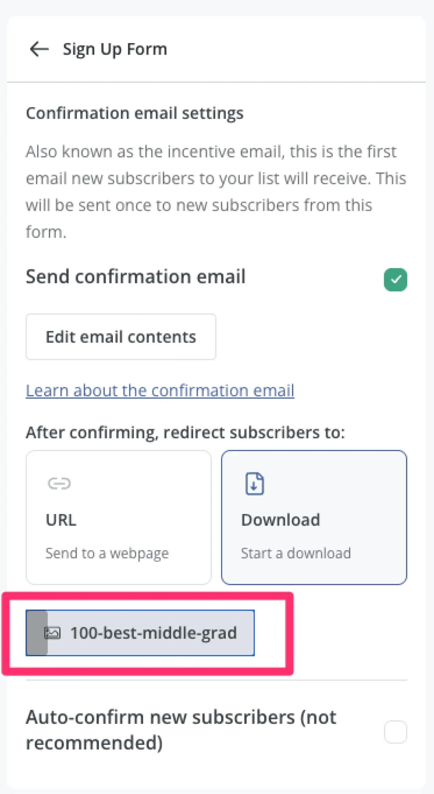 - Choose between sending subscribers to a URL to download the incentive or starting the file download immediately