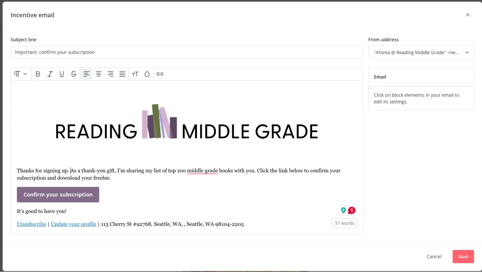 - Click Edit email contents in the right sidebar to update your confirmation email (and tell subscribers what you’re sending them)
