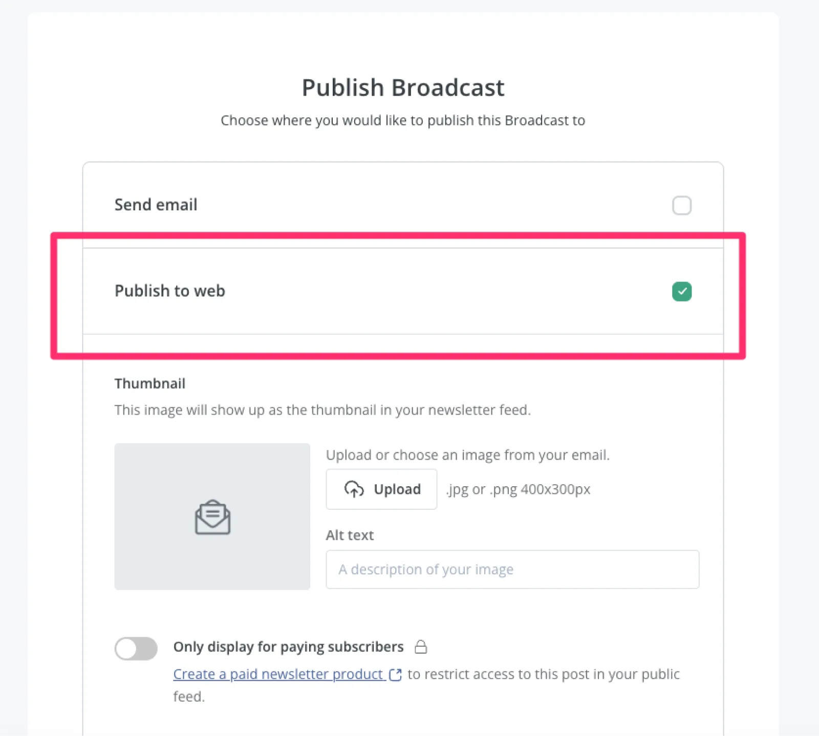 After writing your content, click Continue in the bottom right corner and select Publish to web only. This will create a post on your profile alone, not an email newsletter.