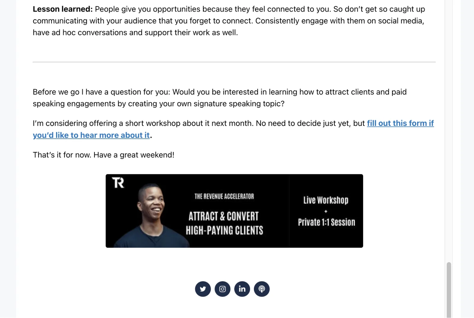 He mentions his products or services and provides links to learn more within his content, but he doesn’t worry too much about pitching directly because he’s implemented a banner at the bottom of his emails that he says does the promoting for him now.