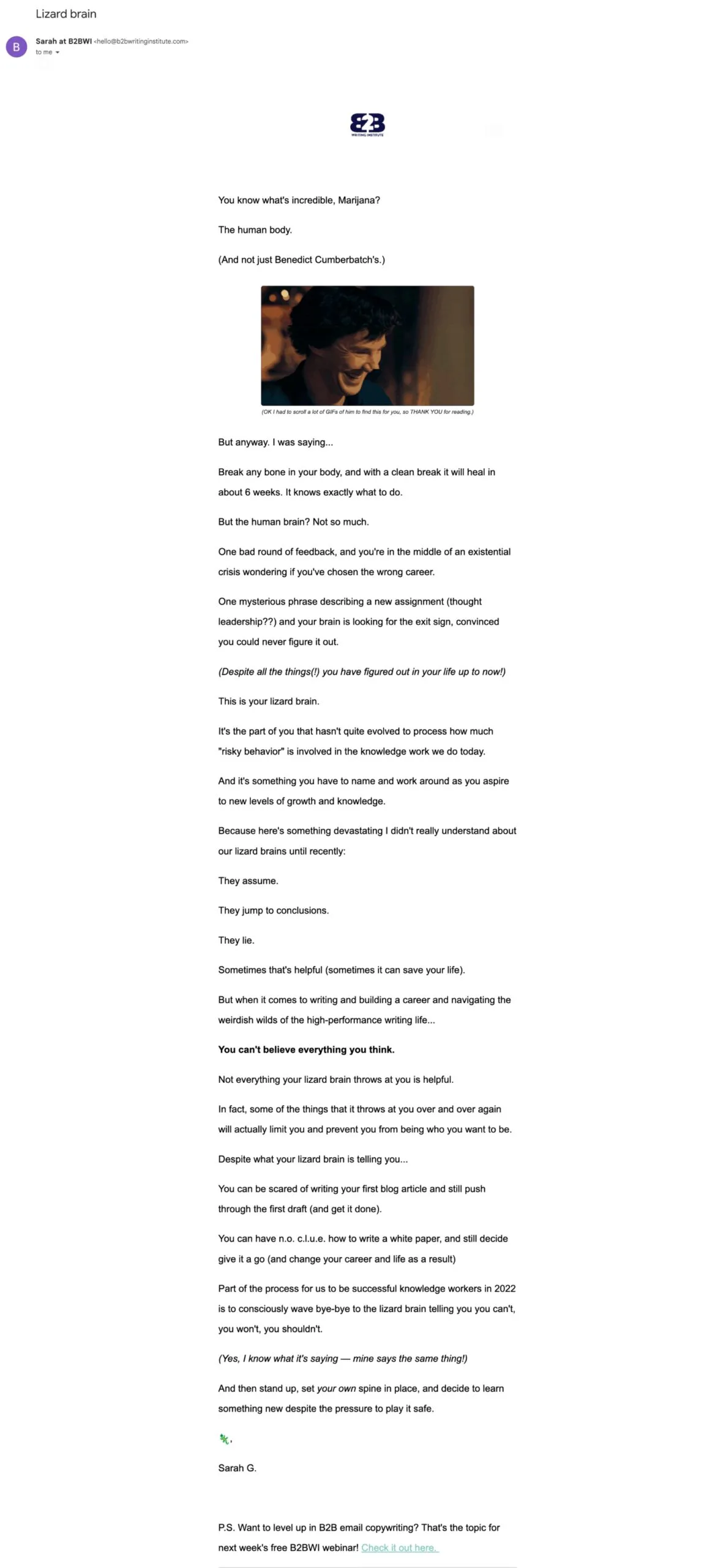 Then, at the end, she hints at an upcoming B2B email copywriting webinar with two short sentences and a link with details and registration.