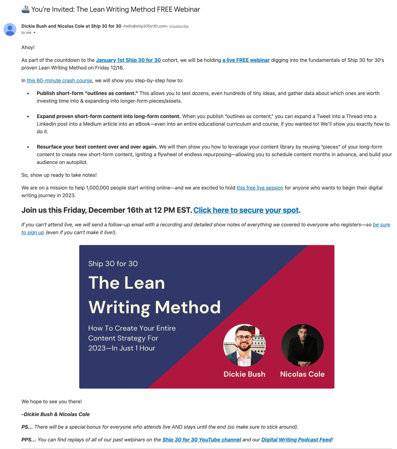 Dickie Bush and Nicolas Cole run Ship 30 for 30, a cohort-based online writing course. In this webinar invitation email, they’ve used long, but scannable bullet points to share what they’ll cover in the webinar.