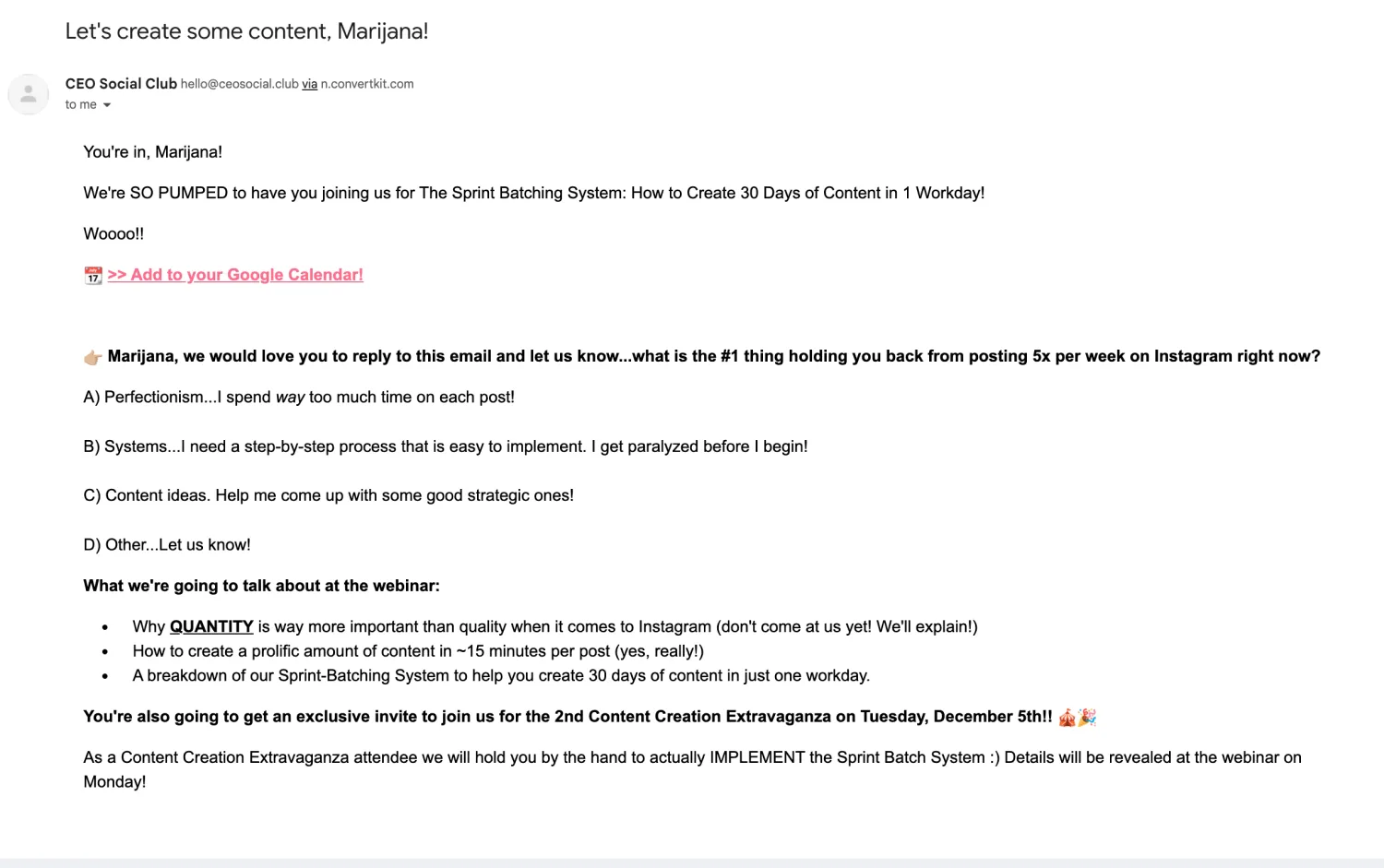 Business coach Courtney Chaal and designer Danielle Connor run CEO Social Club, a community for online business owners. In their webinar confirmation email, they lead with the link that adds this event to the calendar, which also contains the link to access the webinar room.