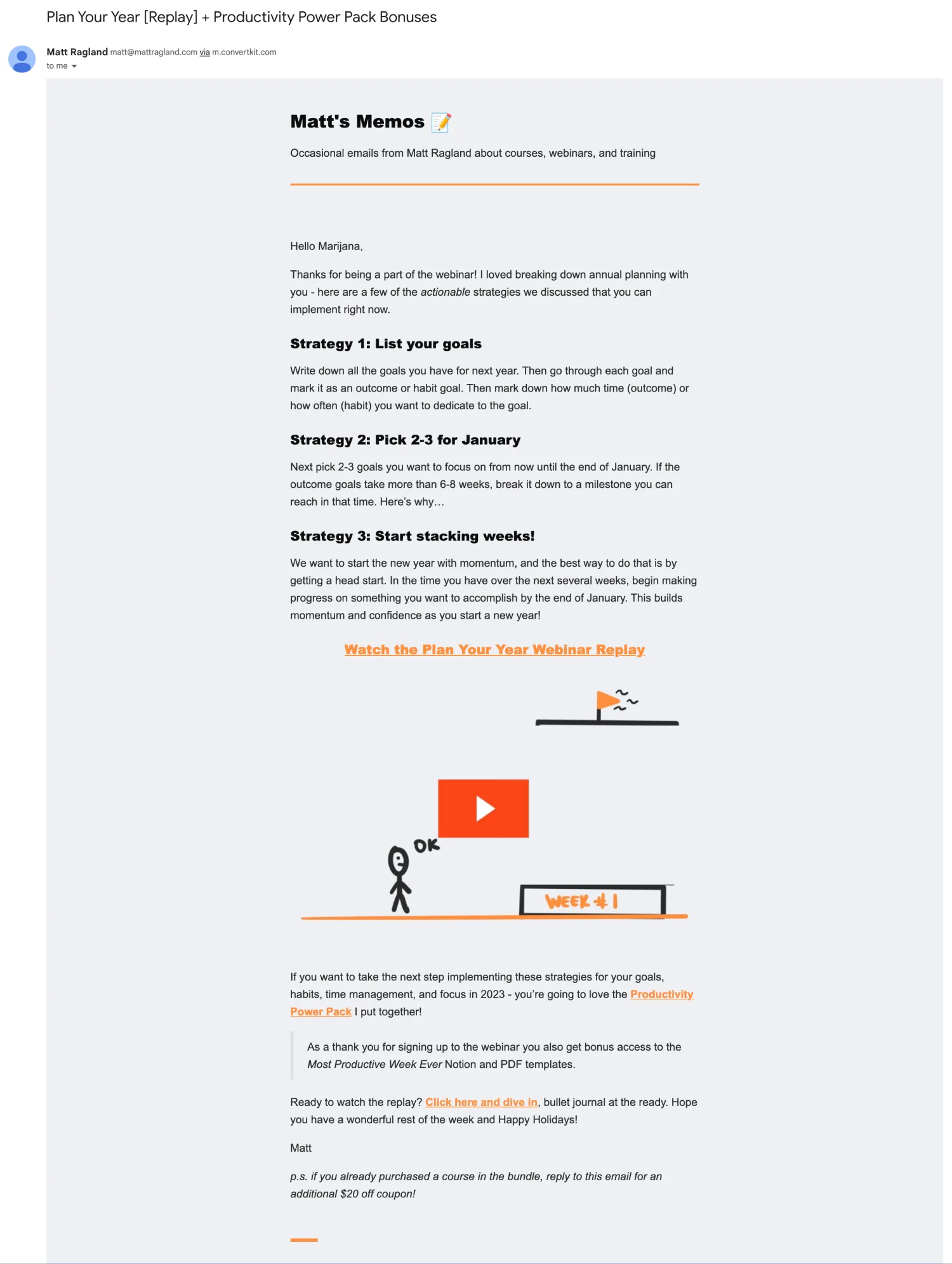 Matt Ragland is a productivity coach and course creator. His annual planning webinar goes over actionable planning strategies, so when he shares the replay, he also summarizes each of the strategies. This makes it easier for his subscribers to want to watch the replay and to follow along.