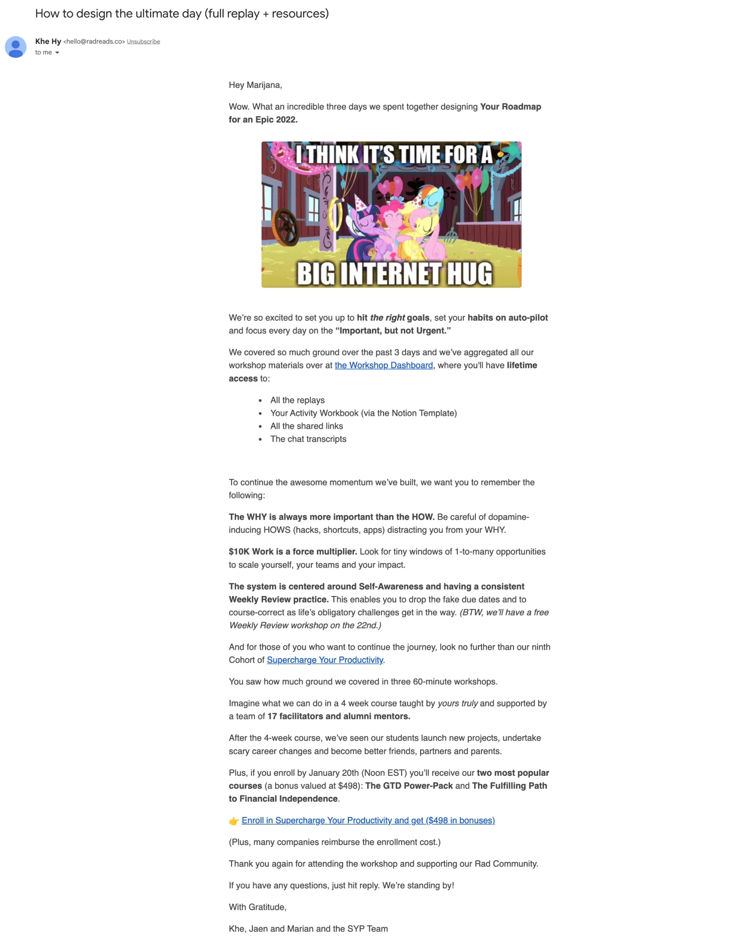 Check out this follow-up webinar email from Khe Hy. He’s the founder of RadReads, a resource for professionals who want to live examined, productive, and joyful lives.