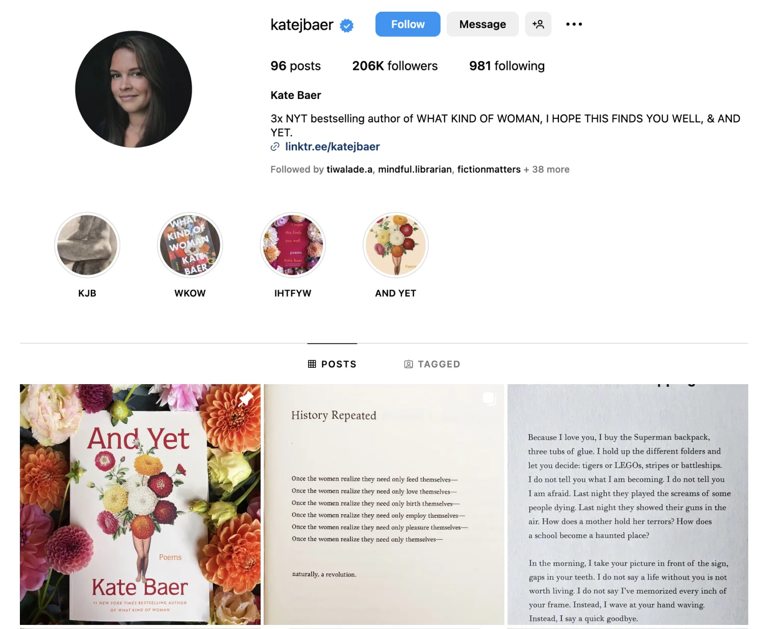 Share your writing on social media: Social media platforms can be ideal avenues for finding new people to share your writing with. Even more visual platforms can be used to grow a writing audience. For inspiration, check out poet and writer Kate Baer, who shares her work on Instagram and has grown her account to 206k followers: